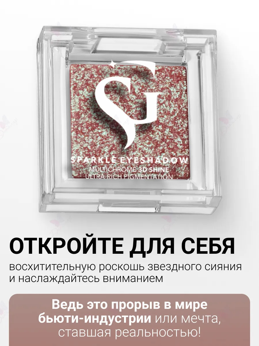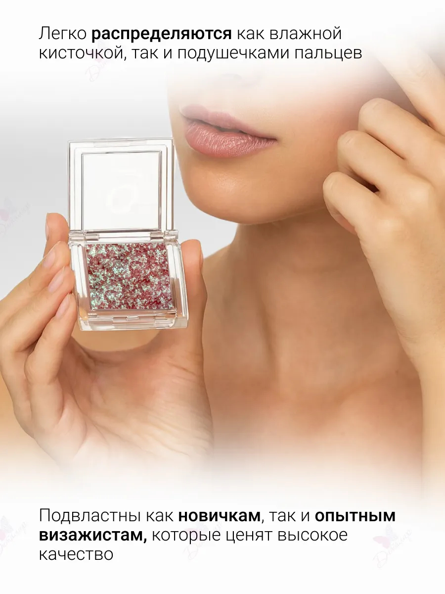 Переливающийся разнодисперсный 3D-глиттер создает на веках тончайшее, одновременно объемное металлическое и дуохромное сияние, зависимо от выбранного оттенка. Создают на веках мерцание, особенно выигрышно смотрится при искусственном освещении.