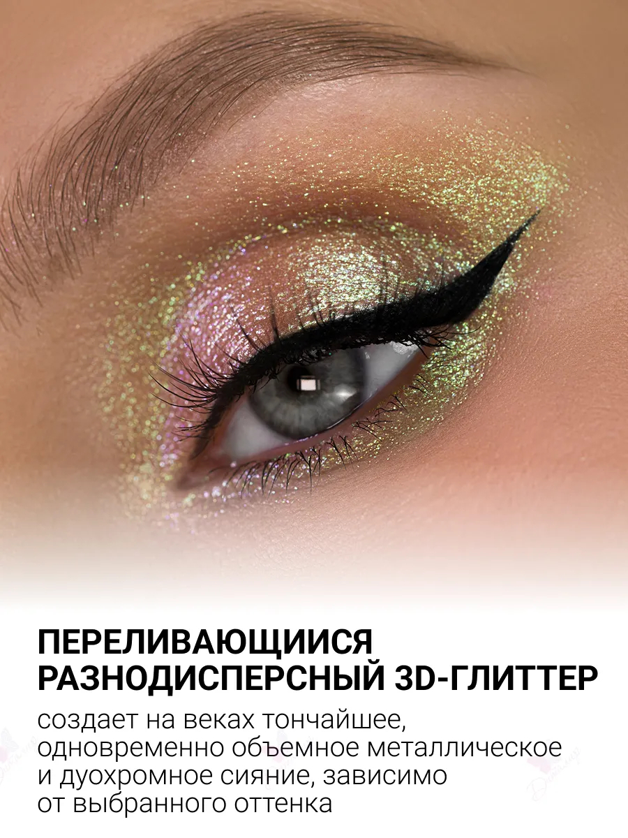 Переливающийся разнодисперсный 3D-глиттер создает на веках тончайшее, одновременно объемное металлическое и дуохромное сияние, зависимо от выбранного оттенка. Создают на веках мерцание, особенно выигрышно смотрится при искусственном освещении.
