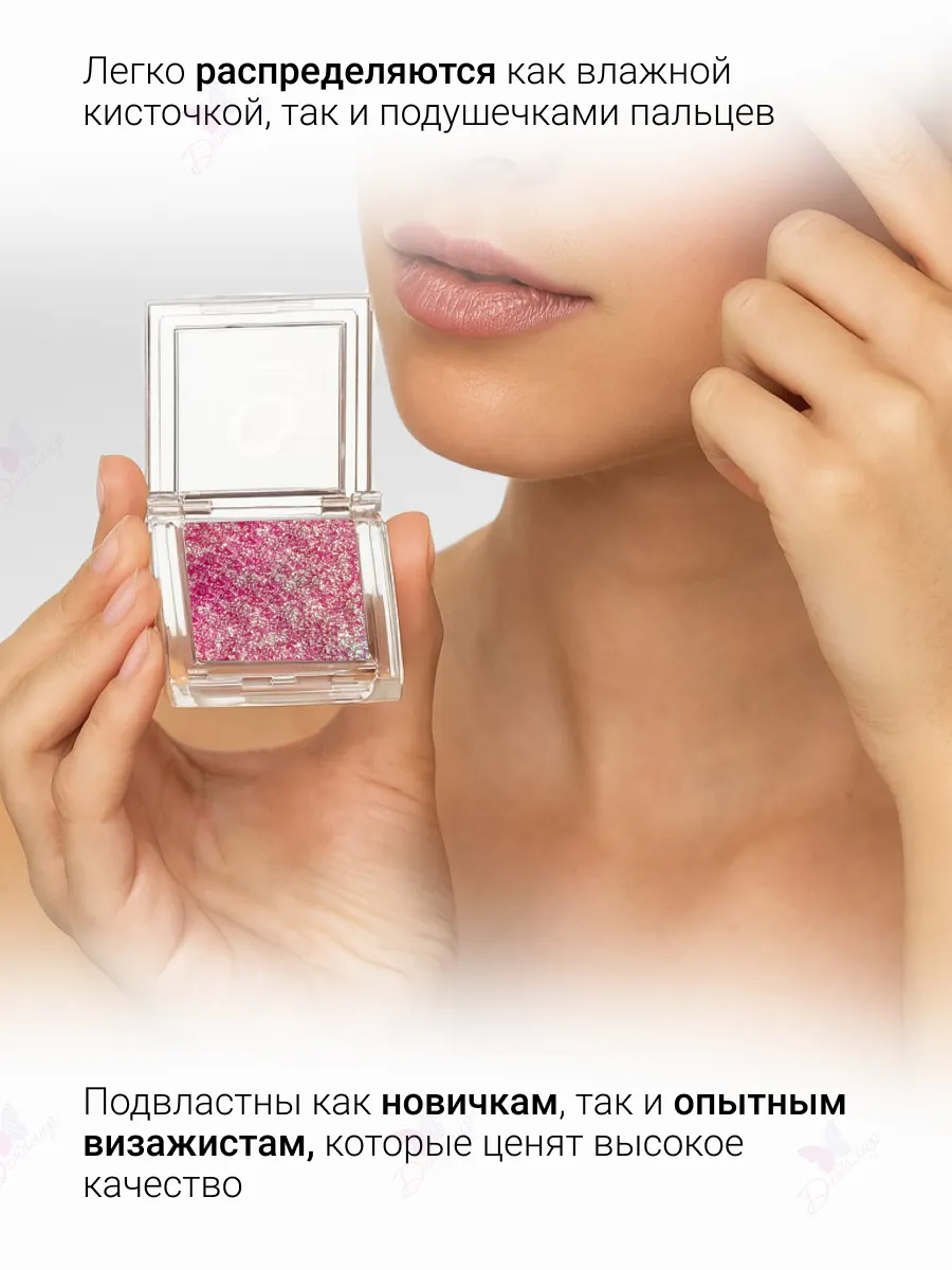 Переливающийся разнодисперсный 3D-глиттер создает на веках тончайшее, одновременно объемное металлическое и дуохромное сияние, зависимо от выбранного оттенка. Создают на веках мерцание, особенно выигрышно смотрится при искусственном освещении.