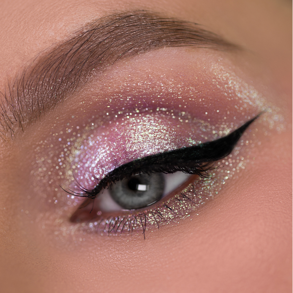 Переливающийся разнодисперсный 3D-глиттер создает на веках тончайшее, одновременно объемное металлическое и дуохромное сияние, зависимо от выбранного оттенка. Создают на веках мерцание, особенно выигрышно смотрится при искусственном освещении.