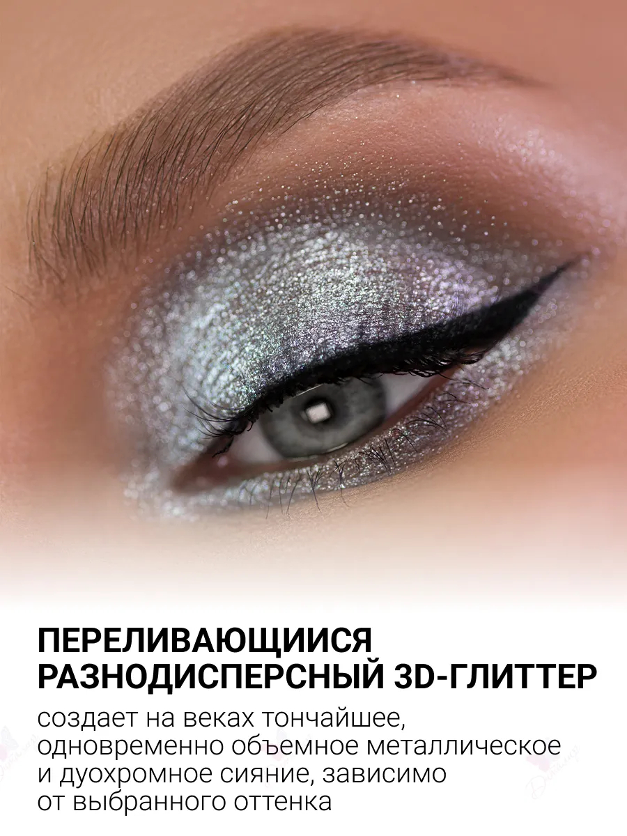 Переливающийся разнодисперсный 3D-глиттер создает на веках тончайшее, одновременно объемное металлическое и дуохромное сияние, зависимо от выбранного оттенка. Создают на веках мерцание, особенно выигрышно смотрится при искусственном освещении.
