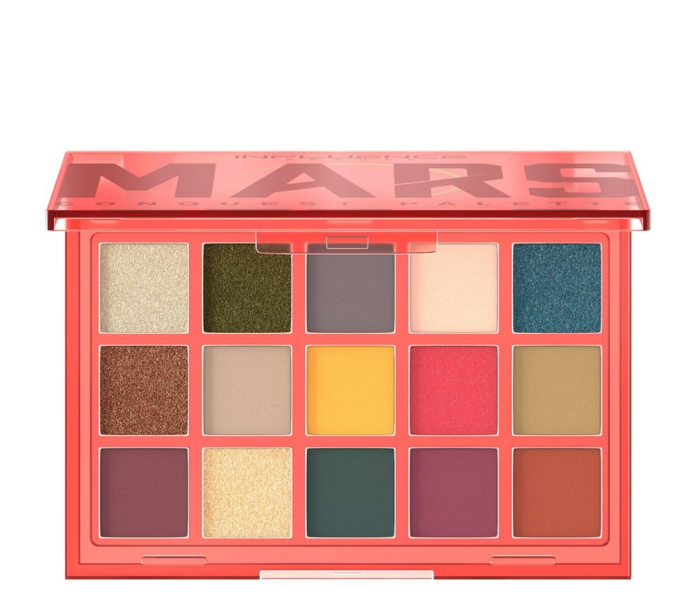 Цветовая фантазия на тему макияжа покорительницы Марса. Теплые терракотовые оттенки палетки скомбинированы с насыщенными зелеными и малиновыми.