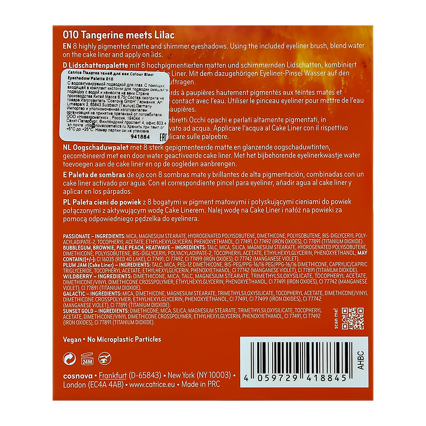 Чтобы раскрыть весь потенциал этой палетки, используйте её для создания самых разнообразных эффектов. Например, вы можете создать выразительный моно-макияж с любым понравившимся цветом. Светлый оттенок во внутреннем уголке глаза и более темный тон на внешнем уголке помогут визуально распахнуть взгляд и увеличить глаза. Светлый шиммерный оттенок на подвижной части века в сочетании с более темным матовым цветом в складке - создадут классный 3D-эффект.Состав