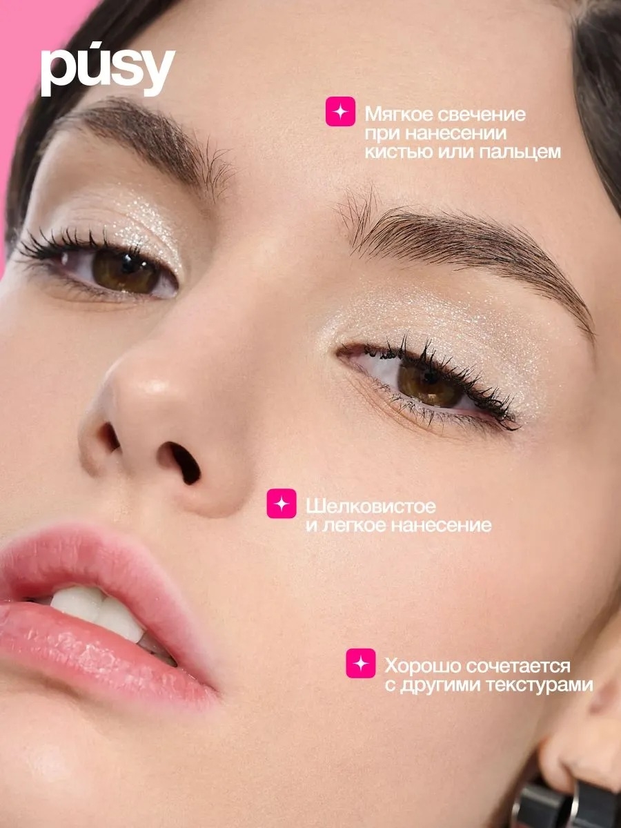 Результат – тот самый сочный, "влажный" блеск, будто глаза покрыли жидким серебром и осыпали бриллиантовой крошкой. Мягкая текстура сияющих теней для век позволяет легко и равномерно распределить продукт, без неровностей и осыпаний. Тени для век блестящие имеют стойкую формулу, что позволяет тебе сиять от первого нанесения до последнего танца.