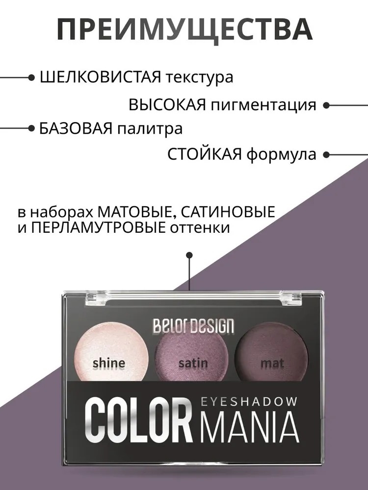 Тени от "Color mania" – это 6 модных и классических сочетаний матовых, сатиновых и перламутровых оттенков. Тени идеально наносятся и растушевываются. А шелковистая и стойкая текстура с первого нанесения создает насыщенный оттенок.