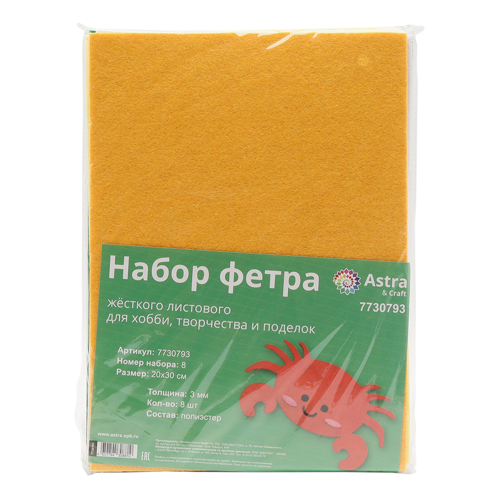 Жесткий листовой фетр "Astra&Craft" – практичный материал для творчества. Фетр не осыпается, его легко сшивать или фиксировать на текстильный клей. Благодаря 'волокнистой' фактуре и небольшому ворсу фетр напоминает шерсть, но при этом гигиеничен, не является питательной средой для микроорганизмов и насекомых. Яркие цвета привлекают внимание.