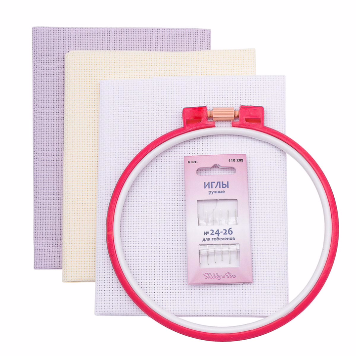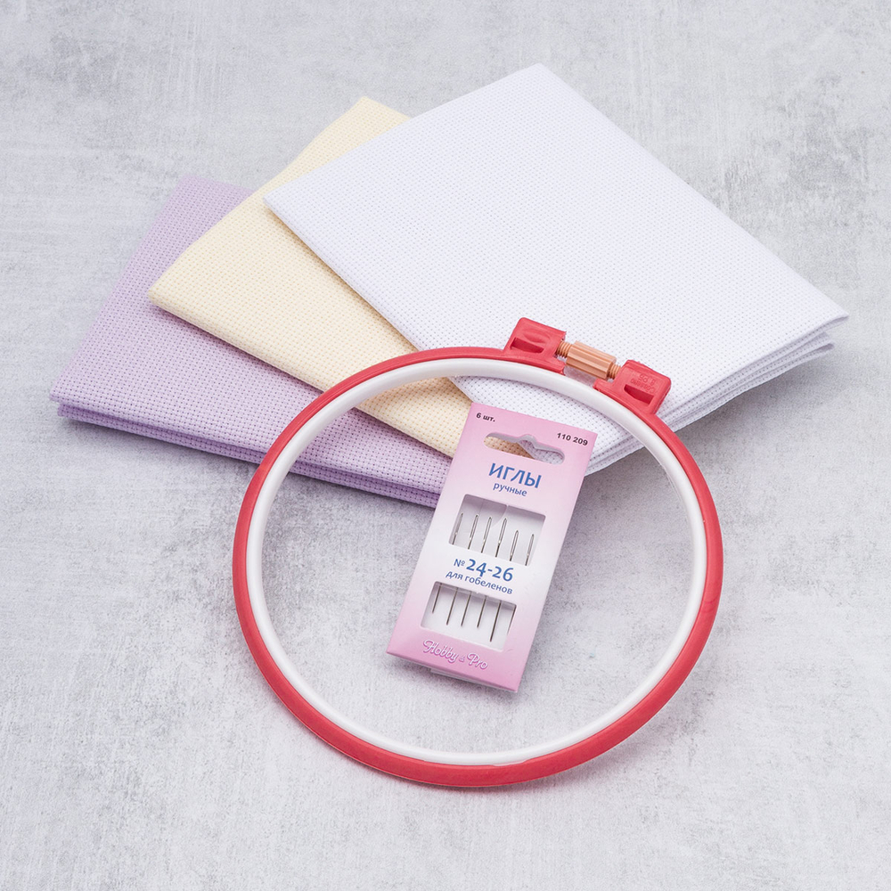 Набор для вышивания в базовой комплектации с основными материалами и инструменты для вышивания: пяльцы для вышивания, цветная канва Aida 14, иглы. Осталось подобрать подходящую схему и можно приступить к работе.