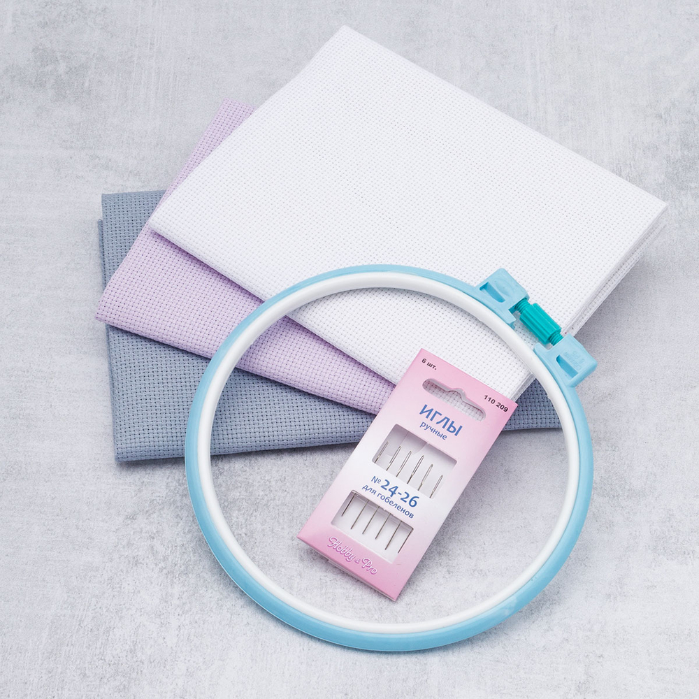 Набор для вышивания в базовой комплектации с основными материалами и инструменты для вышивания: пяльцы для вышивания, цветная канва Aida 14, иглы. Осталось подобрать подходящую схему и можно приступить к работе.