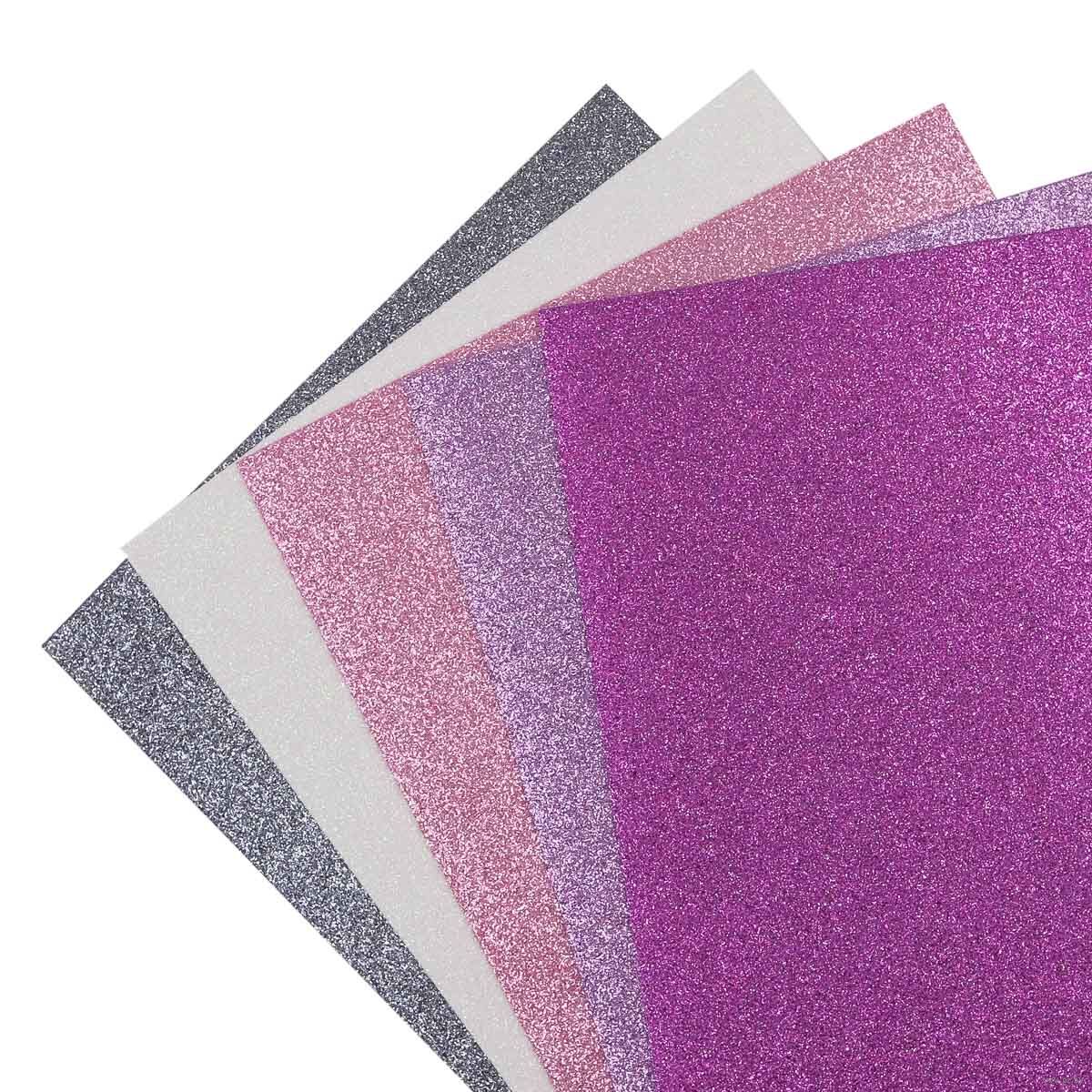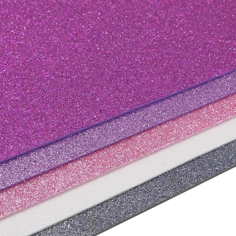 Фоамиран набор включает в себя 5 листов различных оттенков. Блестки, мерцающие на поверхности, придают изделиям особую нарядность и торжественность, делая их привлекательными для создания праздничного декора.