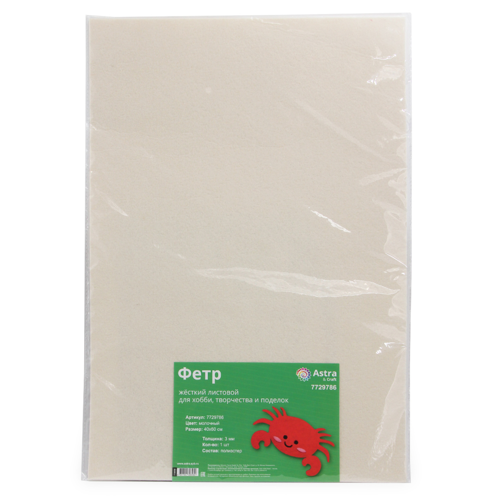 Жесткий листовой фетр Astra&Craft – прекрасный материал для творчества. Он окрашен в яркие цвета, не осыпается, его легко сшивать или фиксировать на текстильный клей.