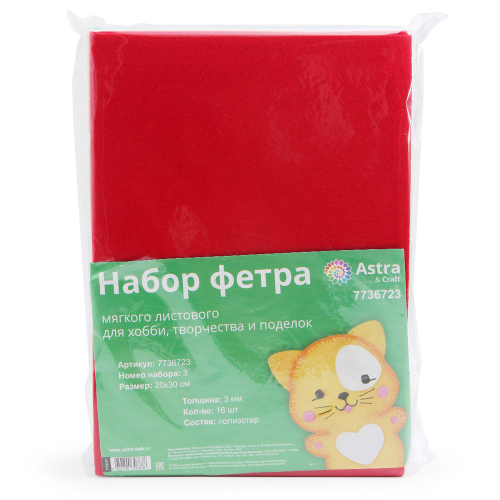 Мягкий листовой фетр от "Astra&Craft" – практичный материал для творчества. Фетр не осыпается, его легко сшивать или фиксировать на текстильный клей. Благодаря 'волокнистой' фактуре и небольшому ворсу фетр напоминает шерсть, но при этом гигиеничен, не является питательной средой для микроорганизмов и насекомых.