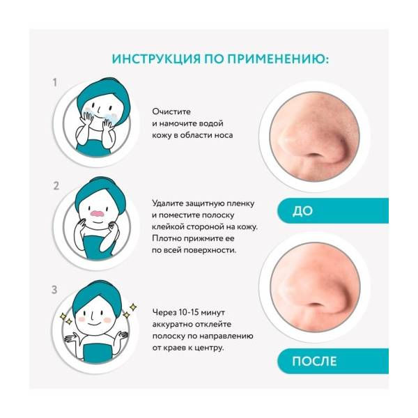 Намочите водой кожу в области носа, удалите защитную пленку с полоски, плотно прижмите ее, оставьте на 10-15 минут, аккуратно отклейте средство от краев к центру.Состав