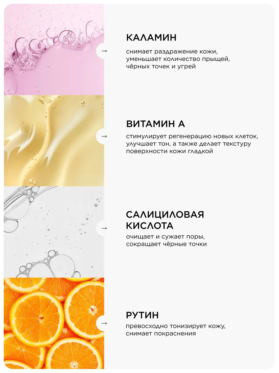Эффективно очищает поры, сужает их и успокаивает раздражённую кожу. Помогает от прыщей, угрей, чёрных точек и покраснений.