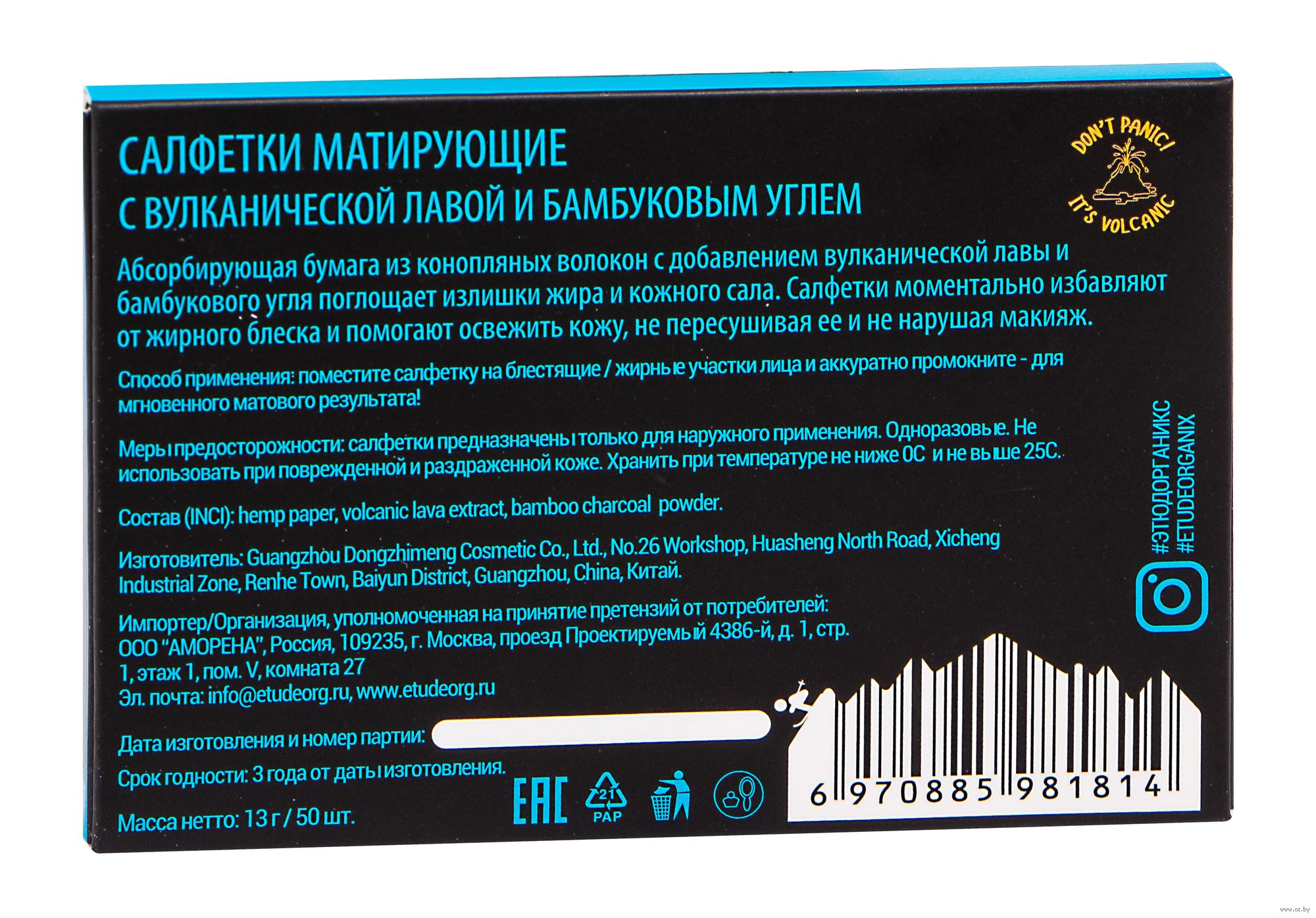 Абсорбирующая бумага из конопляных волокон с добавлением вулканической лавы и бамбукового угля поглощает излишки жира и кожного сала. Салфетки моментально избавляют от жирного блеска и помогают освежить кожу, не пересушивая её и не нарушая макияж.