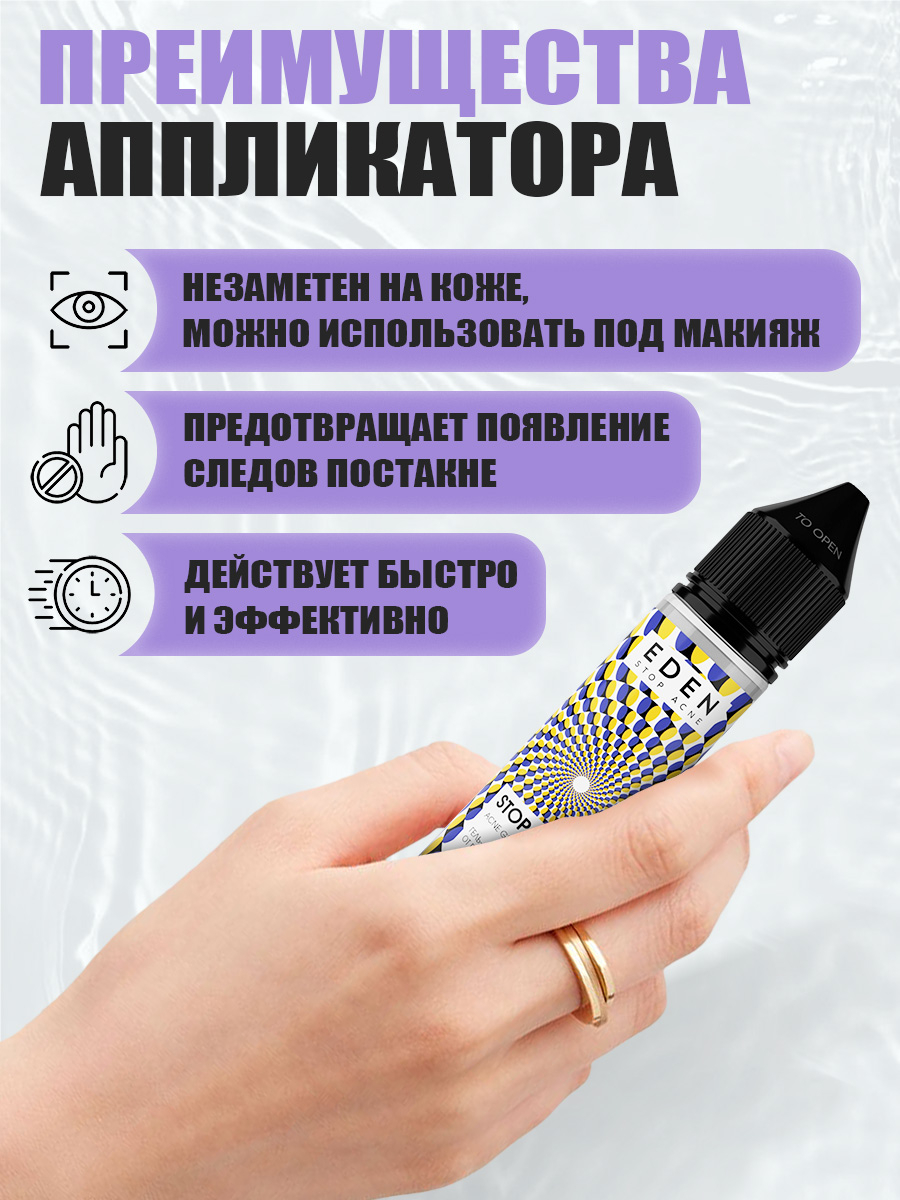 Благодаря активному составу, точечное нанесение средства, на сами воспаления, позволяет устранить их максимально быстро, препятствуя повторному появлению.