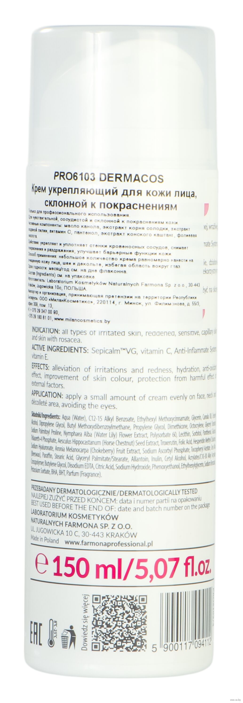 Крем укрепляющий для кожи склонной к куперозу рекомендуется для чувствительной, куперозной кожи, кожи чрезмерно реактивной, реагирующей на внешние факторы, склонной к розовым угрям, раздражениям, аллергическим реакциям, с сосудистым рисунком.