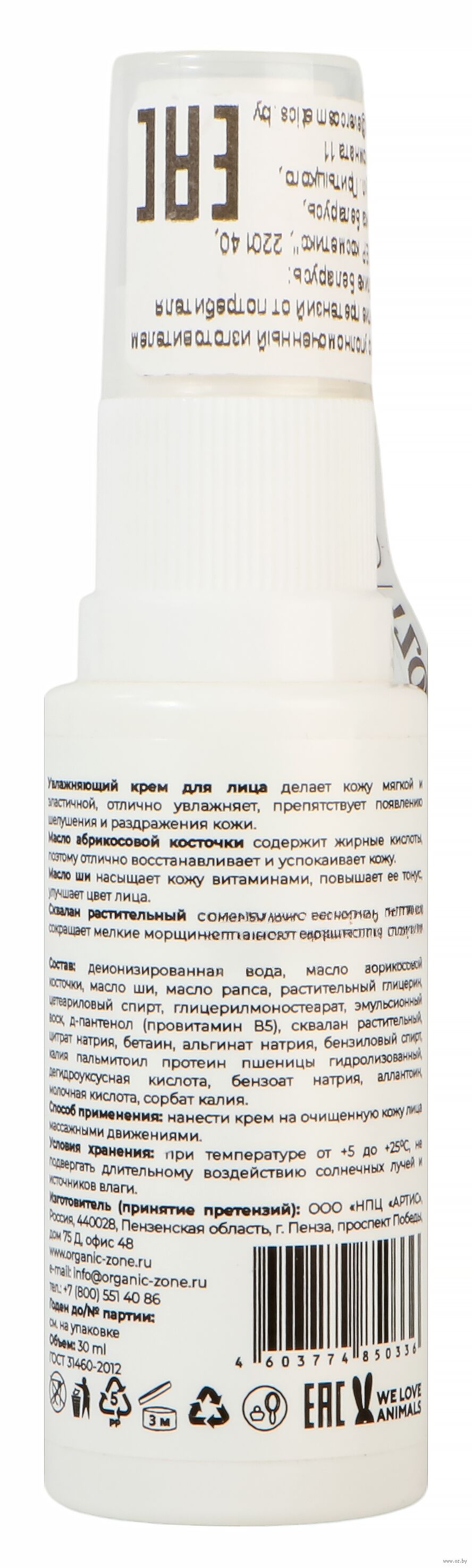 Увлажняющий крем для лица делает кожу мягкой и эластичной, отлично увлажняет, убирает раздражение кожи. Масло абрикосовой косточки содержит жирные кислоты, поэтому отлично восстанавливает и успокаивает кожу. Масло ши насыщает витаминами, улучшает цвет лица и повышает тонус кожных покровов. Сквалан растительный смягчает, удерживает влагу, сокращает мелкие морщинки.