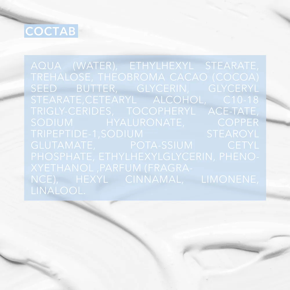 Aqua (Water), Ethylhexyl Stearate, Trehalose, Theobroma Cacao (Cocoa) Seed Butter, Glycerin, Glyceryl Stearate, Cetearyl Alcohol, C10-18 Triglycerides, Tocopheryl Acetate, Sodium Hyaluronate, Copper Tripeptide-1, Sodium Stearoyl Glutamate, Potassium Cetyl Phosphate, Ethylhexylglycerin, Phenoxyethanol, Parfum (Fragrance), Hexyl Cinnamal, Limonene, Linalool.