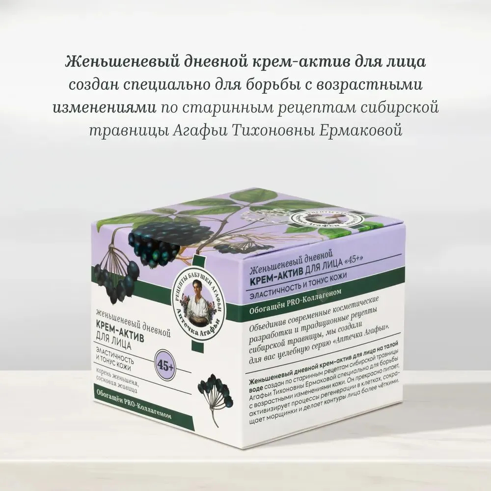 Женьшеневый дневной крем-актив для лица на талой воде создан по старинным рецептам сибирской травницы Агафьи Тихоновны Ермаковой специально для борьбы с возрастными изменениями кожи. Он прекрасно питает, активизирует процессы регенерации в клетках, сокращает морщинки и делает контуры лица более чёткими.