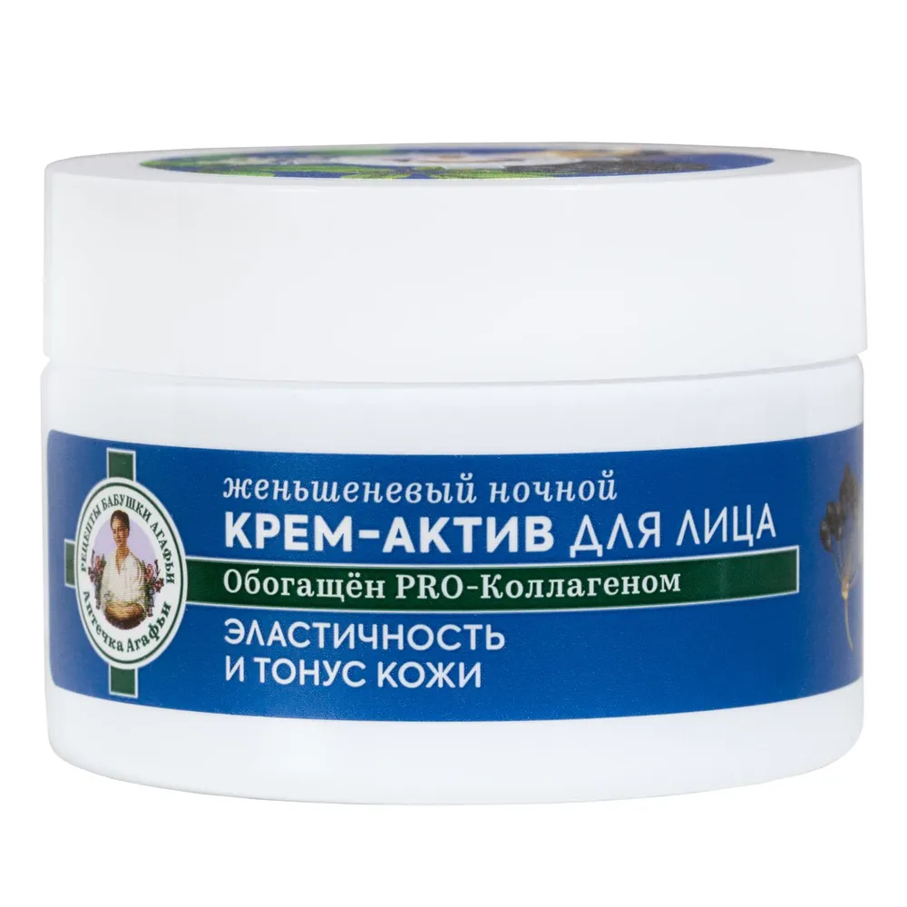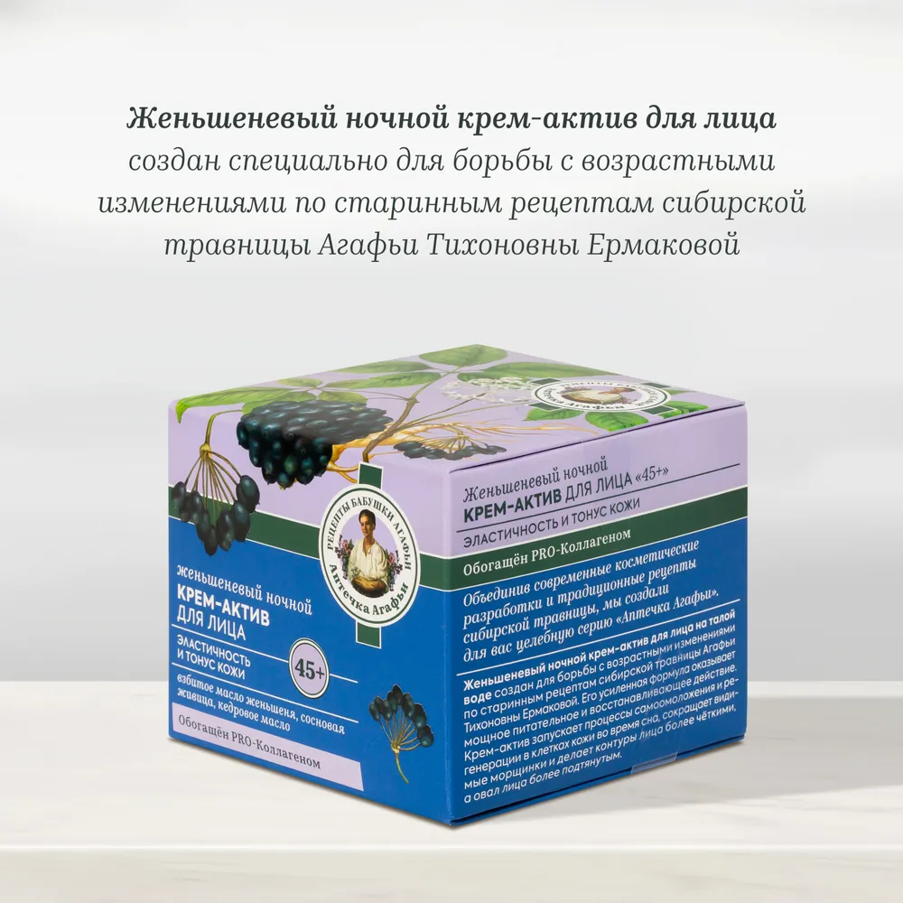 Женьшеневый ночной крем-актив для лица на талой воде создан для борьбы с возрастными изменениями по старинным рецептам сибирской травницы Агафьи Тихоновны Ермаковой. Его усиленная формула оказывает мощное питательное и восстанавливающее действие. Крем-актив запускает процессы самоомоложения и регенерации в клетках кожи во время сна, сокращает видимые морщинки и делает контуры лица более чёткими, а овал лица более подтянутым.