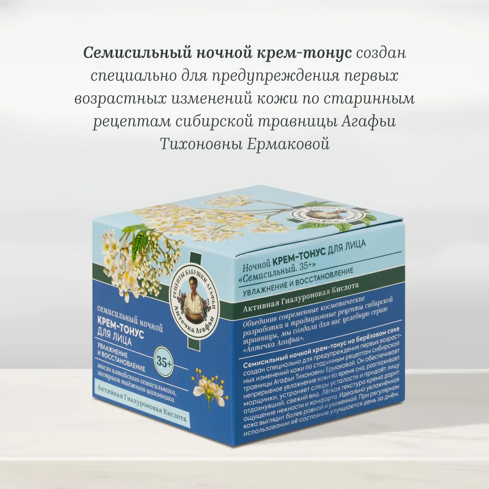 Семисильный ночной крем-тонус на берёзовом соке создан специально для предупреждения первых возрастных изменений кожи по старинным рецептам сибирской травницы Агафьи Тихоновны Ермаковой. Он обеспечивает непрерывное увлажнение кожи во время сна, разглаживает морщинки, устраняет следы усталости и придаёт лицу отдохнувший, свежий вид. Лёгкая текстура крема дарит ощущение нежности и комфорта. Идеально увлажнённая кожа выглядит более ровной и ухоженной.