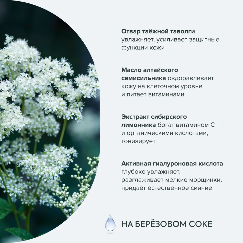 Betula Alba Juice (берёзовый сок) with infusions of Filipendula Formosa Extract (отвар таёжной таволги), Centaurium Erythraea Extract (экстракт алтайского семисильника), Rosa Canina Fruit Extract (экстракт таёжного шиповника), Aloe Arborescens Flower Extract (экстракт столетника), Schisandra Chinensis Fruit Extract (экстракт лимонника); Caprylic/Capric Triglyceride, Glycerin, Glyceryl Stearate, Cetearyl Alcohol, Butyrospermum Parkii Butter, Sodium Cetearyl Sulfate, Linoleic Acid, Oleic Acid, Linolenic Acid (витамин F), Methylsulfonylmethane (органическая сера), Sodium PCA, Sodium Lactate, Arginine, Aspartic Acid, PCA, Glycine, Alanine, Serine, Valine, Proline, Threonine, Isoleucine, Histidine, Phenylalanine (комплекс аминокислот), Sodium Hyaluronate (гиалуроновая кислота), Retinyl Palmitate (витамин А), Ubiquinone (коэнзим Q10), Allantoin, Sodium