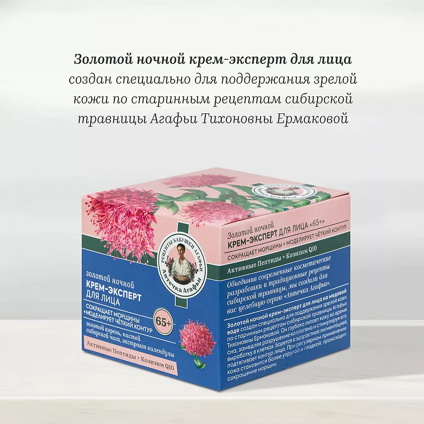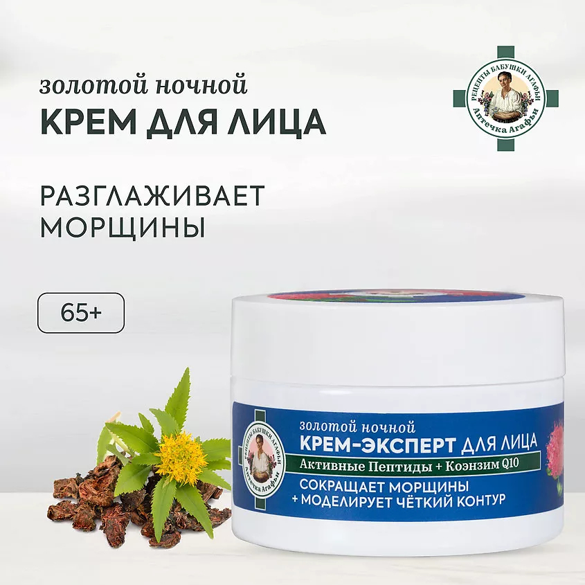 Золотой ночной крем-эксперт для лица на медовой воде создан специально для поддержания молодости зрелой кожи по старинным рецептам сибирской травницы Агафьи Тихоновны Ермаковой. Он глубоко питает кожу и пробуждает в ней скрытую силу, запуская процессы самоомоложения, борется с пигментацией, разглаживает морщины и делает овал лица более чётким.