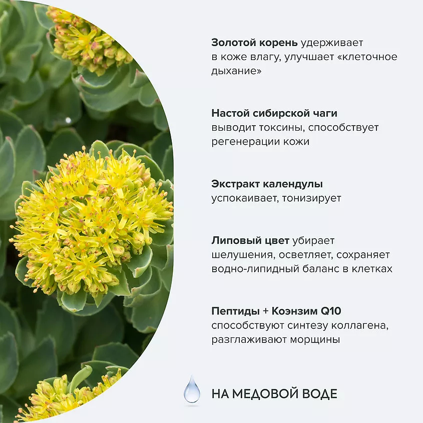 Mel Extract (медовая вода) with infusions of Rhodiola Rosea Root Extract (экстракт золотого корня), Inonotus Obliquus Extract (настой сибирской чаги), Calendula Officinalis Extract (экстракт календулы), Tilia Cordata Flower Extract (экстракт цветков липы); Oenothera Biennis Oil (масло вечерней примулы), Caprylic/Capric Triglyceride, Triticum Vulgare Germ Oil, Cetearyl Alcohol, Glyceryl Stearate, Butyrospermum Parkii Butter, Palmitoyl Oligopeptide, Palmitoyl Tetrapeptide-3, Palmitoyl Tripeptide-5 (пептидный комплекс), Glycerin, Ubiquinone (коэнзим Q10), Linoleic Acid, Oleic Acid, Linolenic Acid (витамин F), Biotin, Folic Acid, Cyanocobalamin, Niacinamide, Pyridoxine, Riboflavin (комплекс витаминов группы В), Sodium Cetearyl Sulfate, Tocopherol (витамин Е), Sodium Polyacrylate, Xanthan Gum, Citric Acid, Benzyl Alcohol, Ethylhexylglycerin, Parfum, Linalool, Hexyl Cinnamal, Coumarin, Geraniol, Alpha - Isomethyl Ionone.