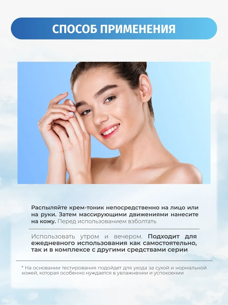 Каждое утро и вечер распыляйте крем-тоник прямо на кожу лица или на руки. Затем помассируйте кожу. Встряхните перед использованием.Состав