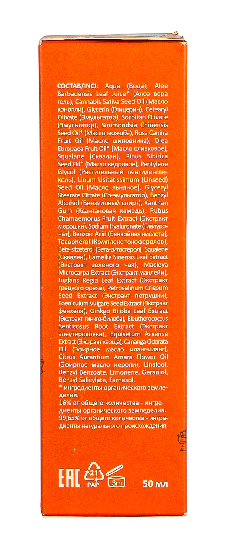 Aqua (вода родниковая), Cannabis Sativa (масло Конопли) Seed Oil, Aloe barbadensis (Алоэ Вера гель) leaf juice, Glyceryl Stearate SE (натуральный эмульгатор из пальмового масла), Leen seed (Льняное масло) Oil, Glycerin (растительный глицерин), Squalene (сквалан ратсительный), Simmondsia Chinensis (Жожоба масло) Seed Oil, Pinus sibirica (Кедровых орешков масло) seed oil, Cetyl Alcohol (цетиловый спирт из кокосового масла), Olea Europaea (Оливковое масло) fruit oil, SC-CO2 Macleya microcarpa (экстракт Маклейя) Extract, SC-CO2 Juglans regia (экстракт Грецкого ореха) Extract, Tocopherol (витамин Е), Xanthan Gum (ксантановая камедь), Lactic Acid (молочная кислота), Hyaluronic acid (Гиалуроновая кислота), SC-CO2 Rubus chamaemorus (экстракт Морошки) Extract, SC-CO2 Thea sinensis (экстракт Чая зеленого) Extract, SC-CO2 Gingko Biloba (Гинкго-Билоба экстракт) Extract, SC-CO2 Foeniculum Vulgare (экстракт Фенхеля) Extract, SC-CO2 Eleutherococcus senticosus (Элеутерококка экстракт) Extract, SC-CO2 Petroselinum crispum (экстракт Петрушки) Extract, SC-CO2 Equisetum arvense (экстракт Хвоща) L. Extract, СanangaOdorata (эфирное масло Иланг-иланг,) oil, Citrus amara (эфирное масло Нероли) oil, Benzyl Alcohol, Limonen, Linalool.