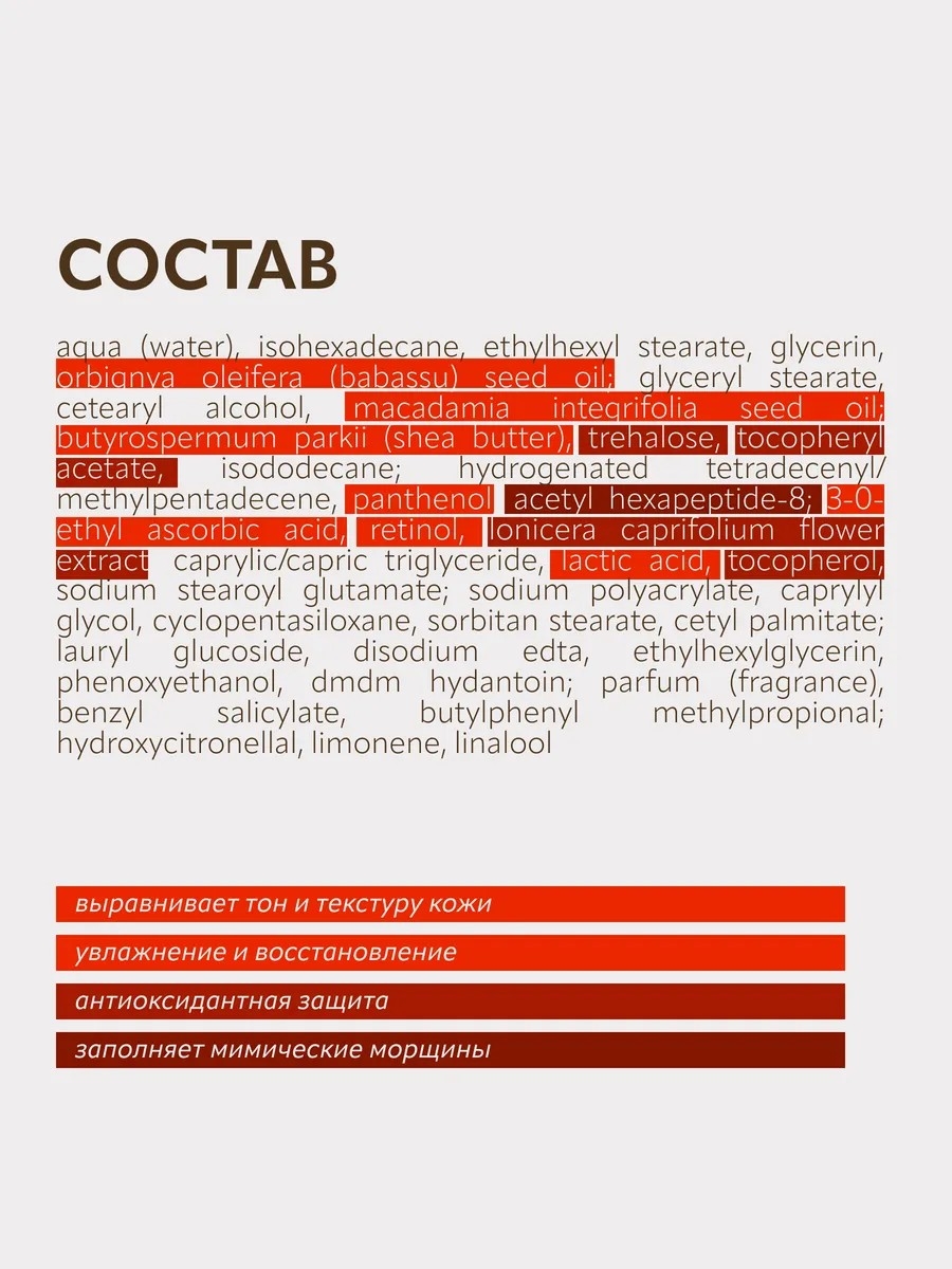 Аqua (water), isohexadecane, ethylhexyl stearate, glycerin, orbignya oleifera (babassu) seed oil, glyceryl stearate, cetearyl alcohol, macadamia integrifolia seed oil, butyrospermum parkii (shea butter), trehalose, tocopheryl acetate, isododecane, hydrogenated tetradecenyl/methylpentadecene, panthenol, acetyl hexapeptide-8, 3-0-ethyl ascorbic acid, retinol, lonicera caprifolium flower extract, caprylic/capric triglyceride, lactic acid, tocopherol, sodium stearoyl glutamate, sodium polyacrylate, caprylyl glycol, cyclopentasiloxane, sorbitan stearate, cetyl palmitate, lauryl glucoside, disodium edta, ethylhexylglycerin, phenoxyethanol, dmdm hydantoin, parfum (fragrance), benzyl salicylate, butylphenyl methylpropional, hydroxycitronellal, limonene, linalool.