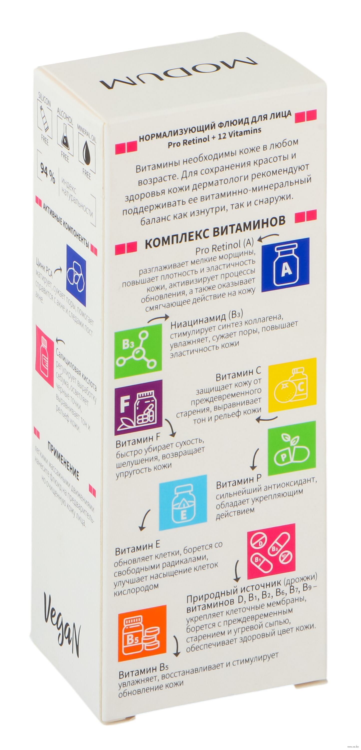 Pro Retinol и 12 витаминов оказывают комплексное воздействие на кожу. Они увлажняют, сужают поры, выравнивают тон и рельеф кожи, повышают плотность и эластичность кожи, борются с угревой сыпью и преждевременным старением.