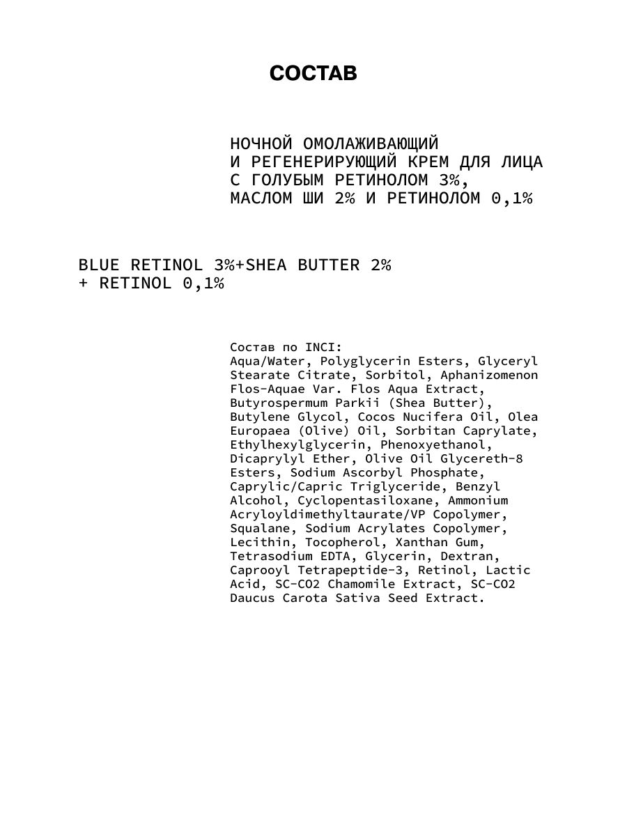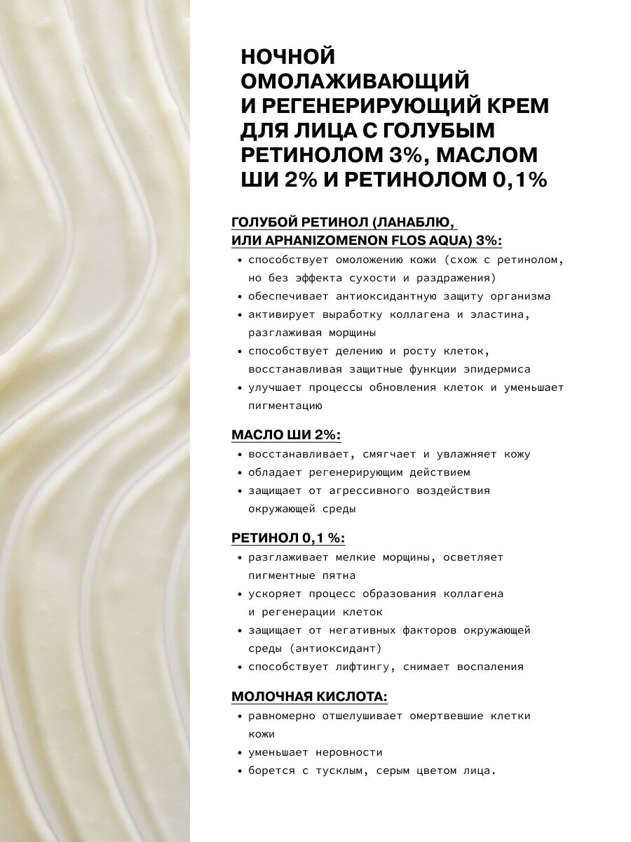 Ночной омолаживающий крем содержит экстракт сине-зелёной эндемичной водоросли. По воздействию на кожу голубой ретинол схож с ретинолом, но без неприятных последствий: сухости, раздражения кожи. Сочетание с маслом ши, 0,1%-м ретинолом и молочной кислотой даёт очень сильный заживляющий, смягчающий, увлажняющий и омолаживающий эффект.