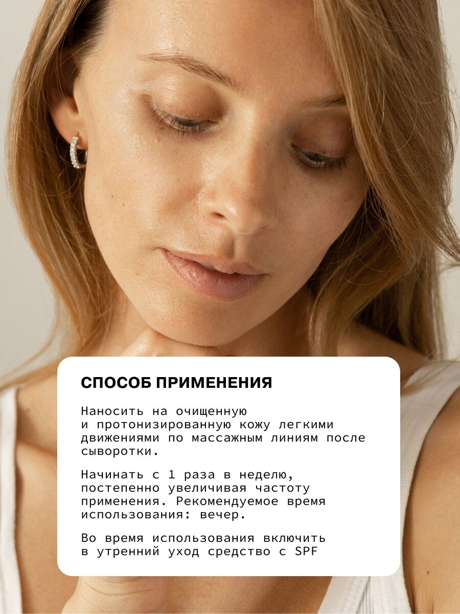 Наносить на очищенную и протонизированную кожу, дождавшись полного высыхания кожи. Начинать с 1 раза в неделю, постепенно увеличивая частоту применения. Рекомендуемое время использования: вечер. Во время использования включить в утренний уход средство с SPF.Состав