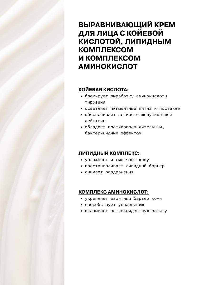 Выравнивающий крем для лица с койевой кислотой, липидным комплексом и комплексом аминокислот.