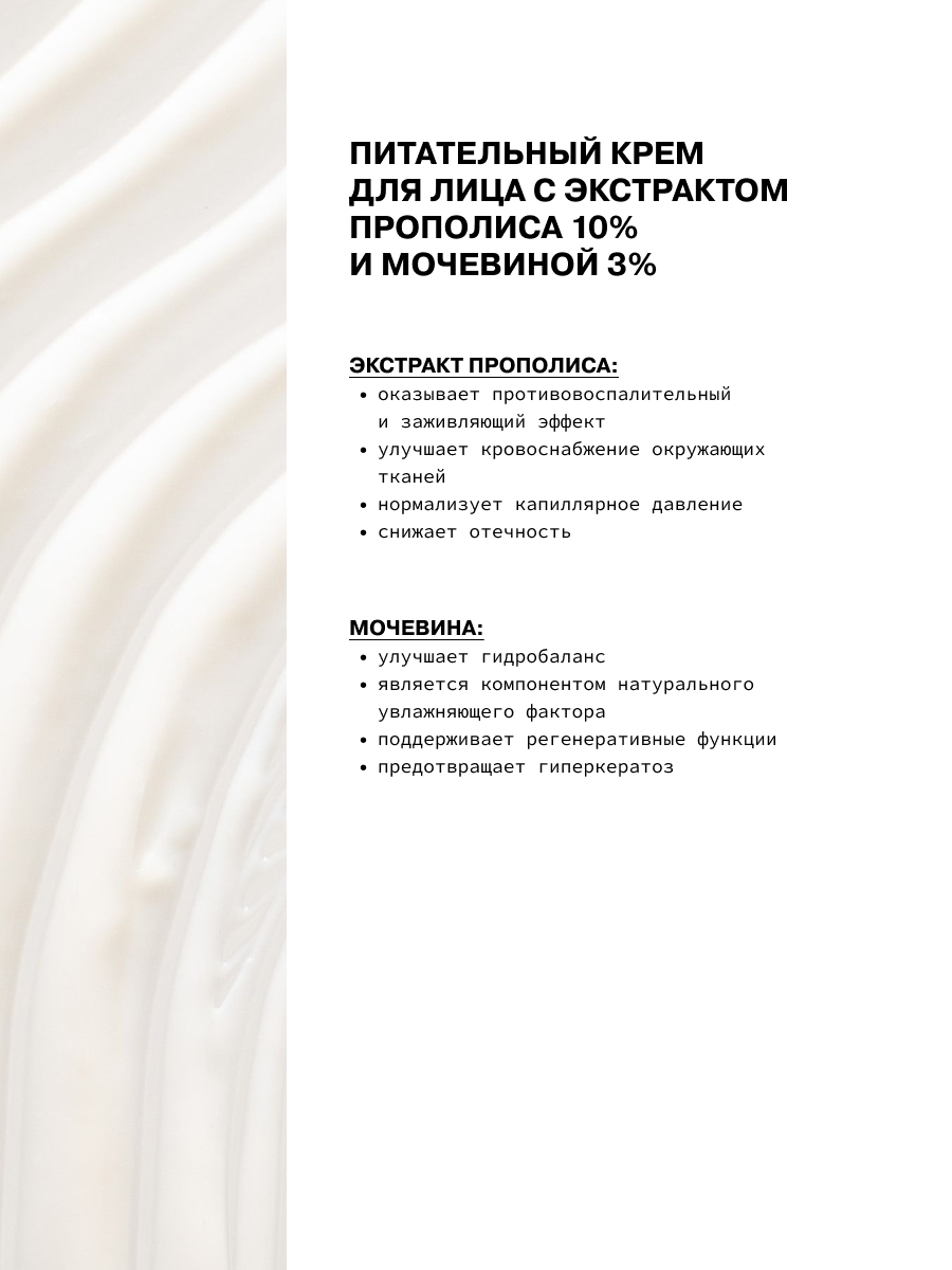 Питательный крем для лица с экстрактом прополиса 10% и мочевиной 3%.