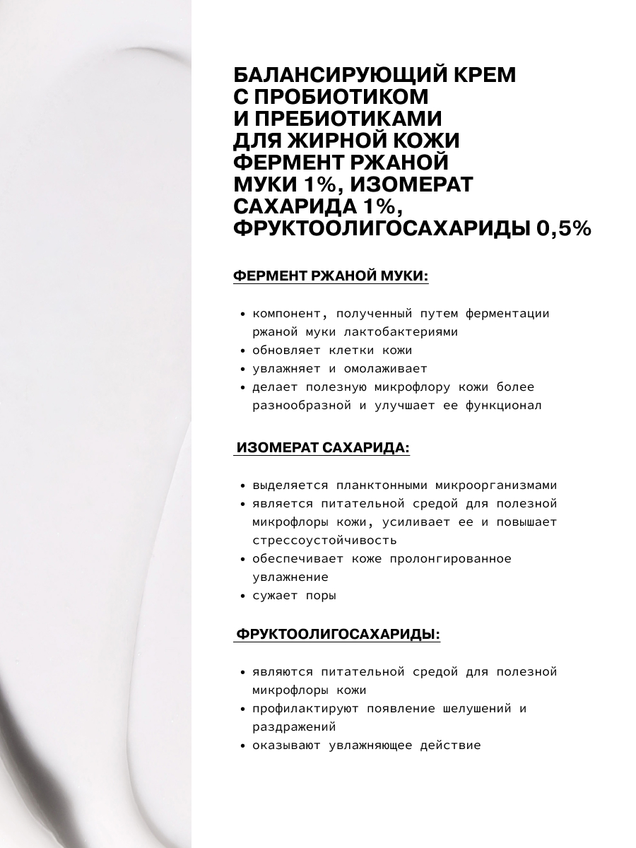 Воздушный крем сочетает в себе два пребиотика и один пробиотик, что дает разносторонний механизм воздействия на кожную микрофлору. В результате она начинает самовосстанавливаться, повышает свое многообразие и стрессоустойчивость. Стабилизация кожного состояния приводит к более чистому, свежему и здоровому состоянию кожи. Корень женьшеня в сочетании с противовоспалительным пептидом бережно ухаживает за порами, профилактирует появление высыпаний, а также снижает покраснения в случае чувствительного состояния