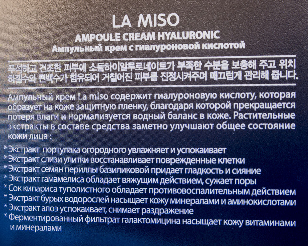 Крем содержит гиалуроновую кислоту, которая образует на коже защитную пленку, благодаря которой прекращается потеря влаги и нормализуется гидробаланс кожи. Основные функции гиалуроновой кислоты в креме: