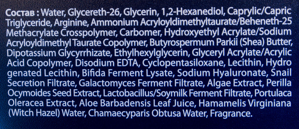 Water, Glycereth-26, Glycerin, 1,2-Hexanediol, Caprylic/Capric Triglyceride, Arginine,Ammonium Acryloyldimethyltaurate/Beheneth-25 Methacrylate Crosspolymer, Carbomer,Hydroxyethyl Acrylate/Sodium Acryloyldimethyl Taurate Copolymer, Butyrospermum Parkii (Shea) Butter, Dipotassium Glycyrrhizate, Ethylhexylglycerin, Glyceryl Acrylate/Acrylic Acid Copolymer, Disodium EDTA, Cyclopentasiloxane, Lecithin, Hydrogenated Lecithin, Bifida Ferment Lysate, Snail Secretion Filtrate, Galactomyces Ferment Filtrate, Algae Extract. Perilla Ocymoides Seed Extract, Lactobacillus/Soymilk Ferment Filtrate, Portulaca Oleracea Extract, Aloe Barbadensis Leaf Juice, Hamamelis Virginiana (Witch Hazel) Water, Chamaecyparis Obtusa Water, Butylene Glycol, Sodium Hyaluronate, Fragrance.Мы используем файлы cookie для обеспечения удобства работы с сайтом и его контакта с пользователем.