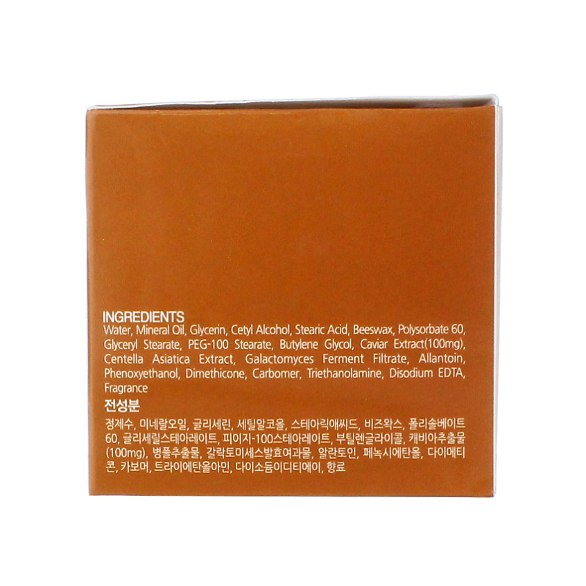 Вода, жидкий парафин, глицерин, цетиловый спирт, стеариновая кислота, пчелиный воск, полисорбат, глицерил стеарат, пэг-100 стеарат, экстракт икры, галактомисис, бутиленгликоль, центелла азиатская, аллантоин, феноксиэтанол, диметикон, карбомер, триэтаноламин, динатрий эдта, парфюм.