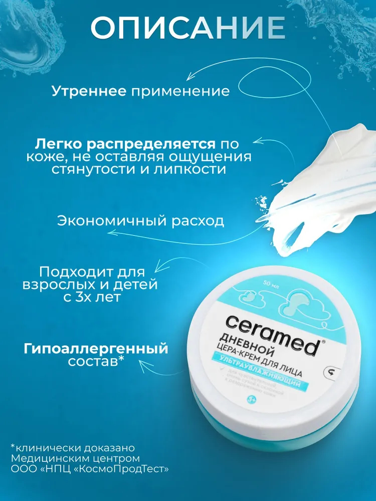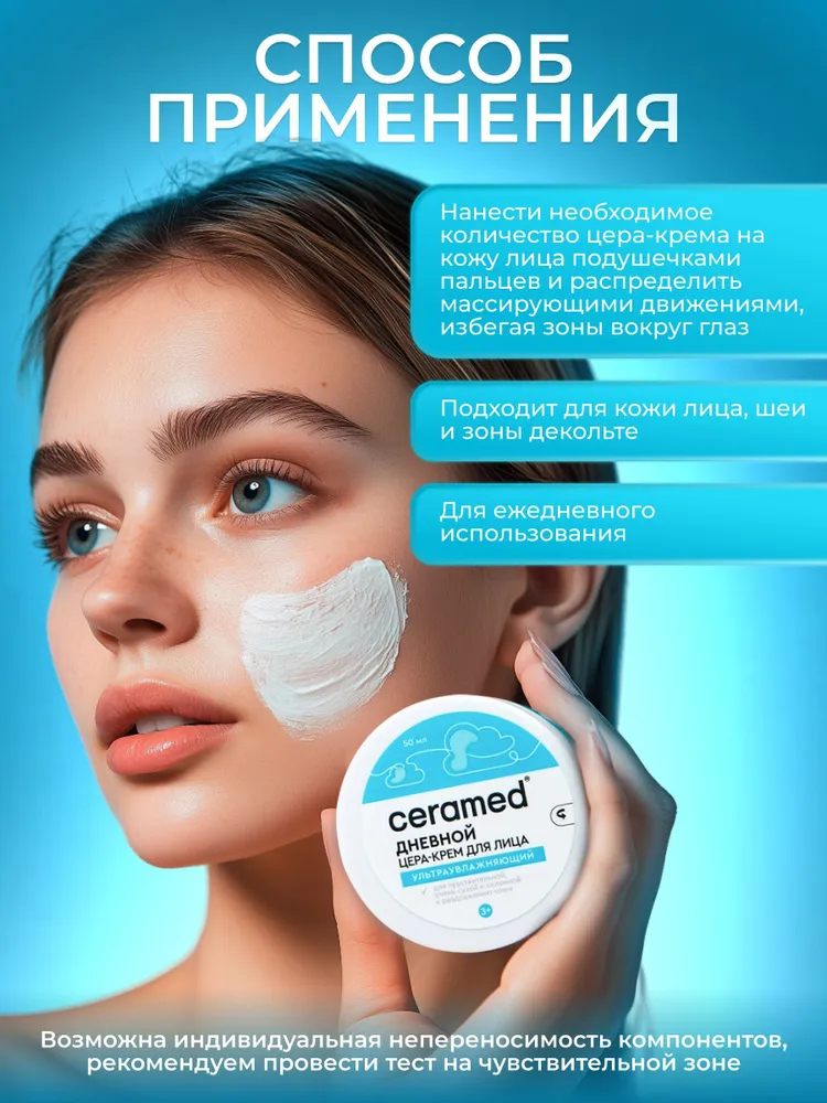 Нанести необходимое количество цера-крема на кожу лица подушечками пальцев и распределить массирующими движениями, избегая зоны вокруг глаз. Подходит для кожи лица, шеи и зоны декольте.Состав