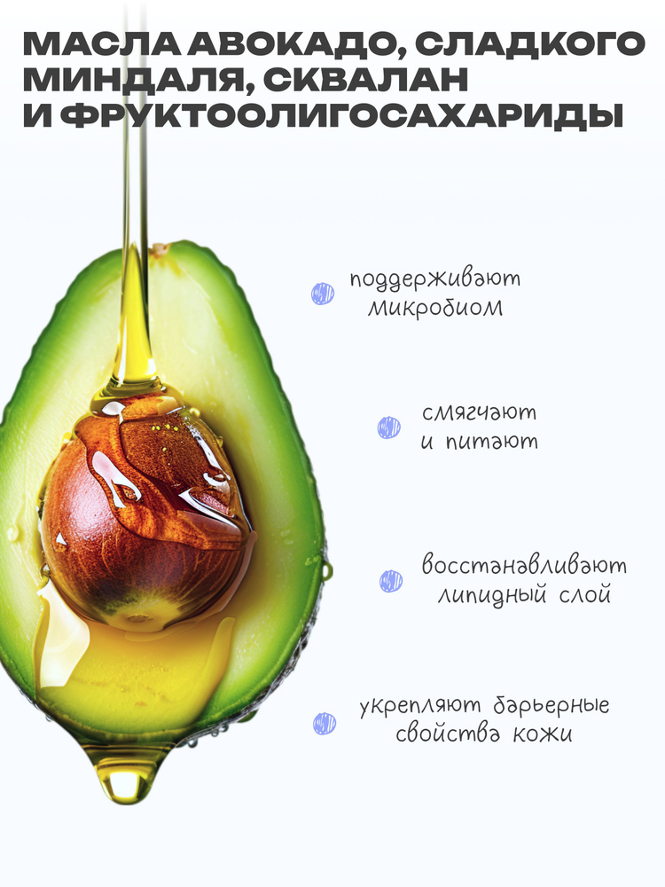 Вода очищенная, глицерин, глицерил стеарат SE, тригептаноин, дикаприлил карбонат, фруктоолигосахариды, масло авокадо, масло сладкого миндаля, каприлик/каприк триглицериды, цетеариловый спирт, сквалан, экстракт центеллы азиатской, экстракт ламинарии, пропиленгликоль, натрия акрилат/натрия акрилоилдиметилтаурат сополимер, каприлгидроксамовая кислота, отдушка, стеароил лактилат натрия, лимонная кислота, ксантановая камедь, глицерил каприлат, сорбат калия, бензоат натрия.
