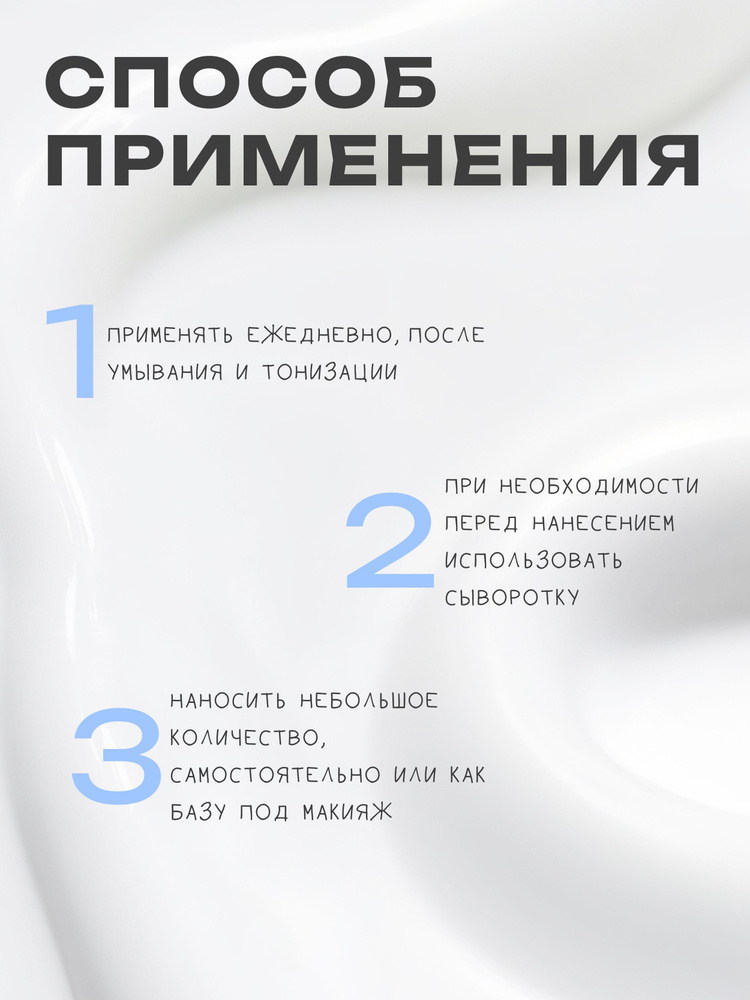 Использовать ежедневно, утром и/или вечером, после умывания и тонизации, самостоятельно или как базу под макияж. При необходимости перед нанесением крема использовать сыворотку или концентрат.Состав