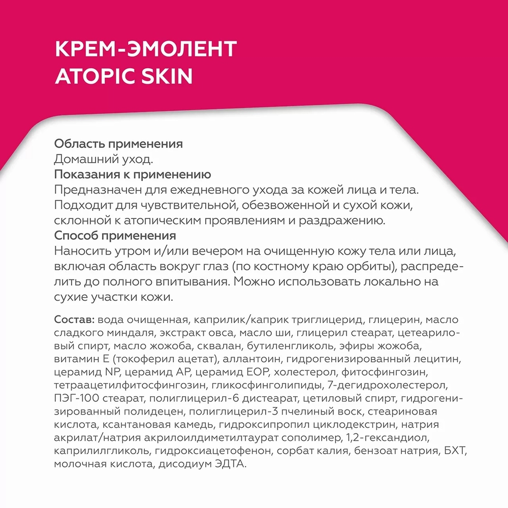 Предназначен для ежедневного ухода за кожей лица и тела. Подходит для чувствительной, обезвоженной и сухой кожи, склонной к атопическим проявлениям и раздражению. Интенсивно питает и смягчает кожу, устраняет сухость и шелушения. Не содержит отдушек.