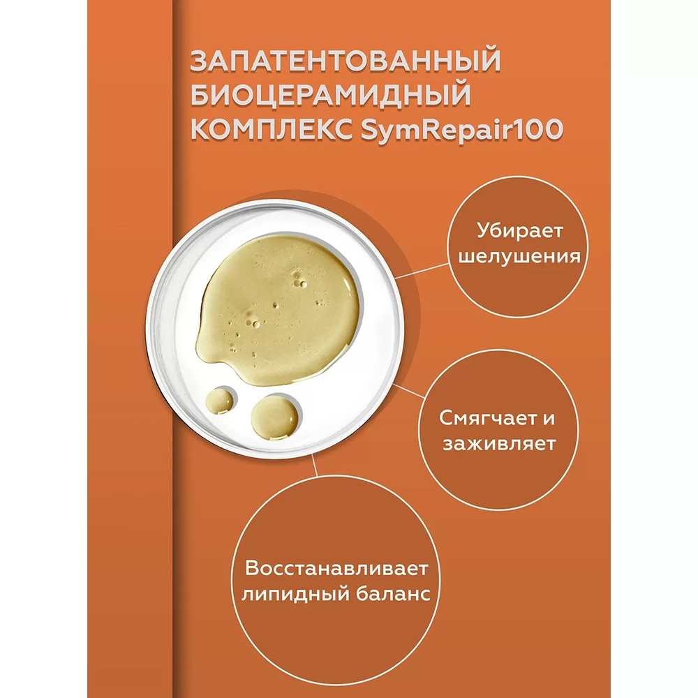 Циклопентасилоксан, диметиконол; каприлик/каприк триглицерид, биоцерамидный комплекс SymRepair100, витамин F, масла: авокадо, зародышей пшеницы, виноградной косточки, календулы, арганы; сквалан, бисаболол, витамины Е и А, отдушка, бутилфенил метилпропиональ, линалоол, гексилциннамаль, лимонен, цитронеллол.