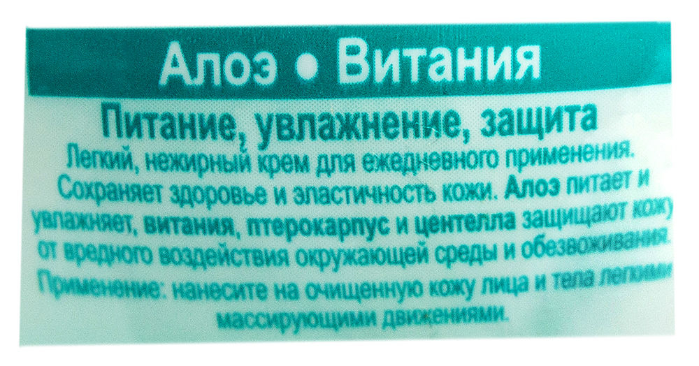 Легкий, нежирный крем для ежедневного применения, удачно сочетаетв себе растительные экстракты, которые восстанавливают жизненные силы кожи. Крем хорошо увлажняет, питает и защищает кожу целый день. Содержит экстракт алоэ, обеспечивающий питание и увлажнение, эктракт витании и кино, которые защищают кожу от воздействия вредных веществ и пересушивания.