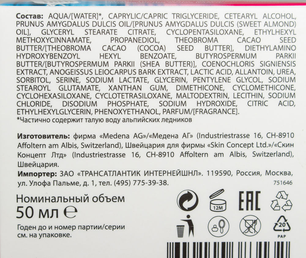 Aqua/[water]*, caprylic/capric triglyceride, cetaryl alcohol, prunus amygdalus dulcis oil/[prunus amygdalus dulcis (sweet almond) oil], glyceryl stearate citrate, cyclopentasiloxane, ethylhexyl methoxycinnamate, propanediol, theobroma cacao seed butter/[theobroma cacao (cocoa) seed butter], diethylamino hydroxybenzoyl hexyl benzonate, butyrospermum parkii butter/[butyrospermum parkii (shea butter)], coenochloris signiensis extract, anogeissus leiocarpus bark extract, lacitic acid, allantoin, urea, sorbitol, serine, sodium lactate, glycerin, pentylene glycol, sodium stearoyl glutamate, xanthan gum, dimethicone, cyclomethicone, cyclohexasiloxane, cyclotetrasiloxane, maltodextrin, lecithin, sodium cloride, disodium phosphate, sodium hydroxide, citric acid, ethylhexylglycerin, phenoxyethanol, parfum/[fragrance].