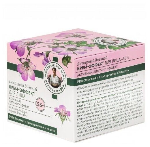 Янтарный дневной крем-эффект для лица на шунгитовой воде создан специально для зрелой кожи по старинным рецептам сибирской травницы Агафьи Тихоновны Ермаковой. Он стимулирует процесс регенерации клеток и интенсивно восстанавливает кожу на всех уровнях, ускоряет клеточное обновление, активизирует образование коллагена и помогает бороться с основными признаками возраста: морщины, потеря упругости, неровный тон, тусклый цвет лица. Кожа становится мягче, выглядит более сияющей, её тон и текстура выравниваются, морщины и несовершенства сокращаются.
