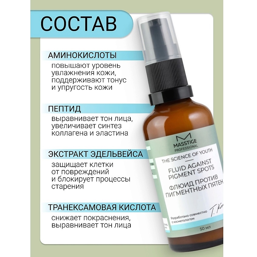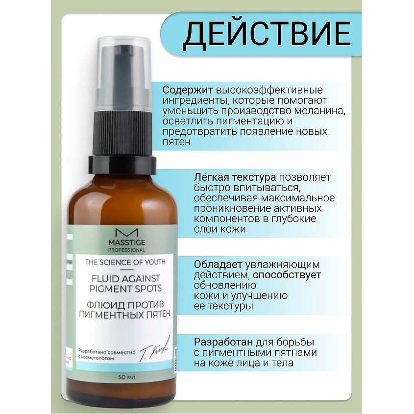 Флюид содержит высокоэффективные ингредиенты, которые помогают уменьшить производство меланина, осветлить пигментацию и предотвратить появление новых пятен. Он также обладает увлажняющим действием, способствует обновлению кожи и улучшению ее текстуры.
