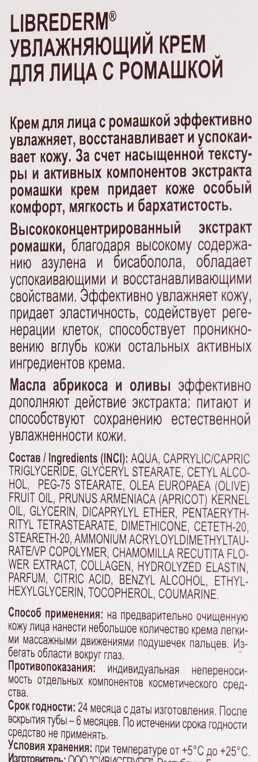 Крем для лица с соком ромашки эффективно увлажняет, восстанавливает и успокаивает кожу. За счет насыщенной текстуры и активных компонентов экстракта ромашки крем придает коже особый комфорт, мягкость и бархатистость.